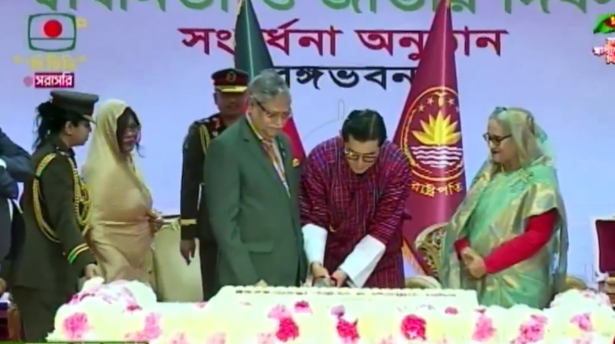 মহান স্বাধীনতা ও জাতীয় দিবস উদযাপন উপলক্ষ্যে ভুটানের রাজা জিগমে খেসার নামগেল ওয়াংচুককে সঙ্গে নিয়ে কেক কেটেছেন রাষ্ট্রপতি মো. সাহাবুদ্দিন ও প্রধানমন্ত্রী শেখ হাসিনা।