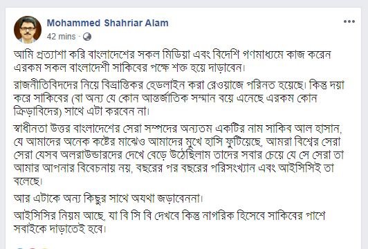 "আমি প্রত্যাশা করি বাংলাদেশের সকল মিডিয়া এবং বিদেশি গণমাধ্যমে কাজ করেন এরকম সকল বাংলাদেশী সাকিবের পক্ষে শক্ত হয়ে দাড়াবেন।