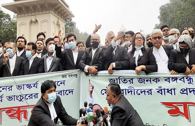 মানববন্ধনে আইনজীবীরা বলেন, ‘বঙ্গবন্ধু এবং বাংলাদেশ এক। বঙ্গবন্ধুর জন্ম না হলে বাংলাদেশরই জন্ম হতো না। আজ স্বাধীনতাবিরোধী চক্র সেই জাতির জনকের ভাস্কর্য ভাঙচুর করেছে। এসব মৌলবাদী জঙ্গিদের দ্রুত আইনের আওতায় এনে শাস্তি নিশ্চিত করতে হবে।’