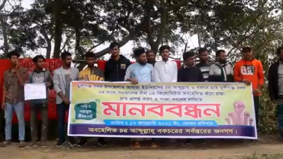 মানববন্ধনে তারা বলেন, অর্ধশত বছর পার হলেও সদরের সঙ্গে সরাসরি কোনো যোগাযোগ ব্যবস্থা তৈরি হয়নি। ফলে এসব গ্রামের প্রায় ২০ হাজার মানুষ ভোগান্তিতে আছেন। কৃষিপণ্য বাজারজাত করতে সমস্যা, স্কুল-কলেজ পড়ুয়া শিক্ষার্থীরাও বিপাকে পড়েছে।