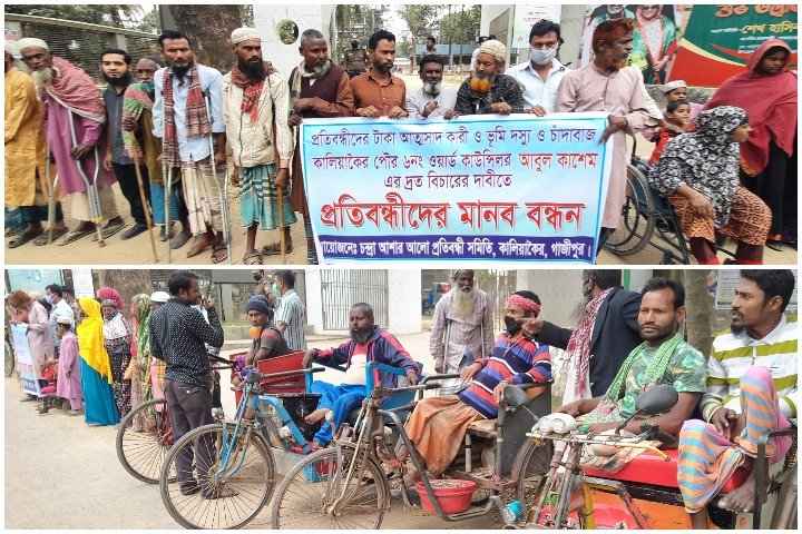 গাজীপুরের কালিয়াকৈরে এক কাউন্সিলরের বিরুদ্ধে প্রতিবন্ধীদের ক্ষতিপূরণের কয়েক লাখ টাকা আত্মসাতের অভিযোগ পাওয়া গেছে। এর প্রতিবাদে শনিবার (২০ ফেব্রুয়ারি) দুপুরে থানার সামনে মানববন্ধন করেছে প্রতিবন্ধীরা। এসময় তারা ওই কাউন্সিলরের বিচার ও আত্মসাতকৃত টাকা ফেরতের দাবি জানান।