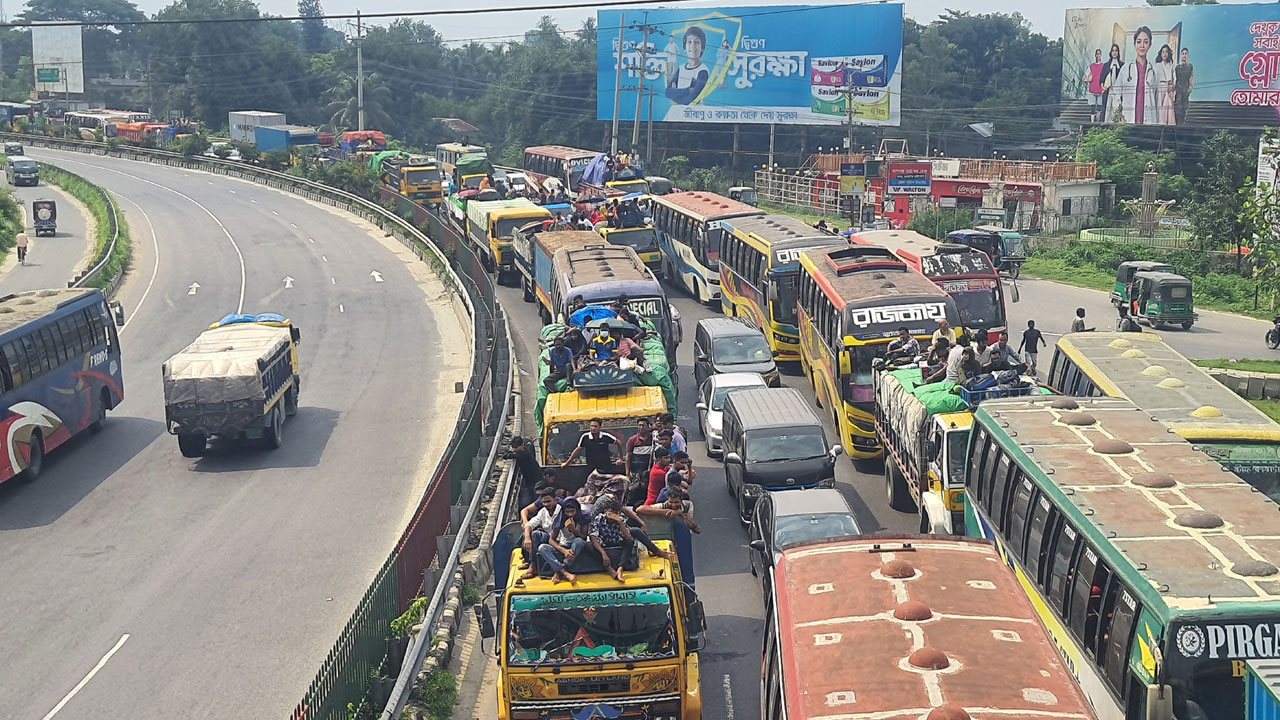 গাজীপুর থেকে আসা পোশাক শ্রমিক জাহানারা বেগম বলেন, গাজীপুর থেকে রাবনা বাইপাস আসলাম ৫ ঘণ্টায়। সড়কে যানবাহনের খুব চাপ। এক জায়গায় থেমে থাকলে ৩০ থেকে ৪০ মিনিট লাগে। ভাড়াও দ্বিগুণ গুনতে হচ্ছে। আমি সিরাজগঞ্জ যাব।