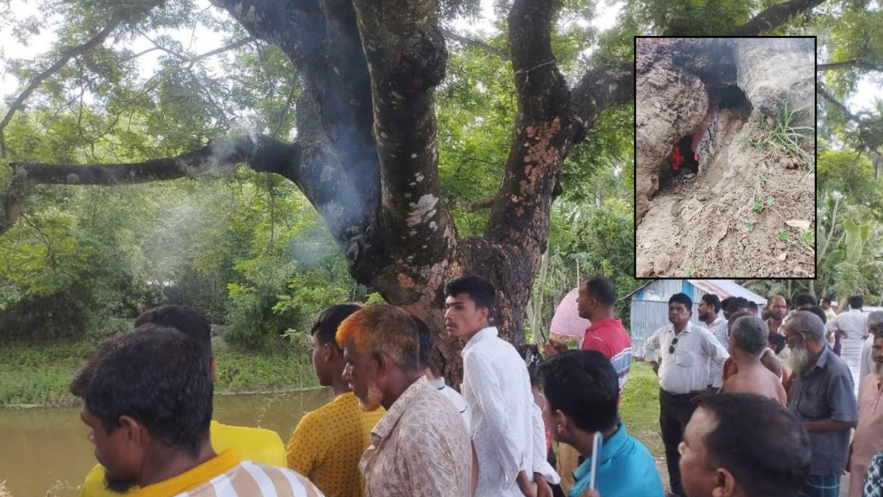স্কুলছাত্রী আশামনি খাতুন বলেন, আমি সকালে স্কুলে এসে শুনতে পাই গাছের ভেতর আগুন জ্বলছে। পরে বান্ধবীদের সঙ্গে এখানে দেখতে এসেছি।