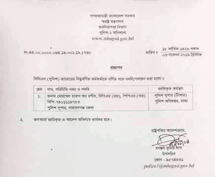নারায়ণগঞ্জের পুলিশ সুপার জনাব মোহাম্মদ হারুন অর রশীদ, বিপিএম (বার), পিপিএম (বার), বিপি-৭৪০১১১৯৭৫৩ কে ঢাকার পুলিশ অধিদপ্তরে পুলিশ সুপার (টিআর) হিসেবে বদলি করা হয়েছে।
