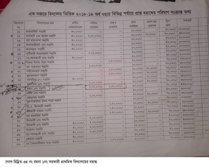 প্রকাশ, ২০১৮-১৯ অর্থ বছরে স্কুল উন্নয়নের জন্য বিভিন্ন পর্যায়ে উপজেলার ৯৩টি প্রাথমিক বিদ্যালয়ে-রুটিন মেইনটেন্যান্স, মাইনর মেরামত, রাজস্ব মেরামত, প্রাক প্রাথমিক, ওয়াস ব্লক মেরামত ও স্লিপ গ্রান্ডের টাকা মিলে সর্ব মোট ১ কোটি ৮৫ লাখ ৩৫ হাজার টাকা বরাদ্ধ দেওয়া হয়।এ সময় উপজেলা প্রাথমিক অফিসার পদে দায়িত্বে ছিলেন মোহাম্মদ নজরুল ইসলাম। তিনি বরাদ্ধোর অর্থ ৯৩টি স্কুলের বিপরীতে বিভাজন করে উপজেলা শিক্ষা কমিটির সভায় পাশ করান। এই বিভাজনে দেখা যায় ৯৩টি স্কুলের মধ্যে রমনা ১ নং সরকারী প্রাথমিক বিদ্যালয়ের বিপরীতে মাইনর মেরামতের জন্য ২ লক্ষ টাকা এবং রাজস্ব মেরামতের জন্য আরও দেড় লক্ষ টাকা বরাদ্ধ সহ প্রাক প্রাথমিক ১০ হাজার টাকা,এবং স্লিপ গ্রান্ড বাবদ ৭০ হাজার টাকা মিলে মোট ৪ লক্ষ ৩০ হাজার টাকা বরাদ্ধ দেওয়া হয়। অথচ বাকী ৯২ টি স্কুলের বিভাজন তালিকায় দেখা যায় যে, যে সকল স্কুলের বিপরীতে মাইনর মেরামতের বরাদ্ধ দেওয়া হয়েছে, সেই স্কুলের বিপরীতে রাজস্ব বরাদ্ধ দেওয়া হয়নি। এই বিভাজনের পর স্কুল প্রতি মোট বরাদ্ধের টাকা ভূয়া ভাউচার দিয়ে রাজস্ব অফিস থেকে উত্তোলন করে মাইনর ও রাজস্ব মেরামতের টাকা অফিস এ্যাকাউন্টে নেওয়া হয় এবং অন্যান্য খাতের টাকা সংশ্লিষ্ট স্কুলের এ্যাকাউন্টে ট্র্যান্সফার করা হয়। মাইনর ও রাজস্ব মেরামতের স্কুল প্রতি বরাদ্ধের অর্ধেক টাকা মেরামতের জন্য প্রথম পর্যায়ে ছাড় দেওয়া হয়। প্রথম পর্যায়ের ছাড়কৃত টাকার কাজ সরেজমিনে পরিদর্শন শেষে পরবর্তি বাকী টাকা ছাড় দেওয়ার কথা । এরই মধ্যে তৎকালীন শিক্ষা অফিসার মোহাম্মদ নজরুল ইসলাম অন্যত্র বদলী হয়ে যান। সম্প্রতি মোঃ আবু ছালেহ সরকার উপজেলা শিক্ষা অফিসার পদে যোগদান করেন।