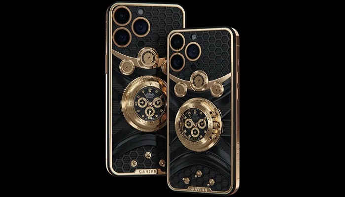 প্রযুক্তি ডেস্ক: রোলেক্স কসমোগ্রাফ ডেটোনা মডেলের ঘড়ির ডায়াল বসানো হয়েছে আইফোনের পেছনে। স্বর্ণের প্রলেপ দিয়ে তৈরি করা হয়েছে এই ঘড়ি। আকারে ছোট আরও তিনটি স্বর্ণের প্রলেপযুক্ত ঘড়ির ডায়াল পাশাপাশি আছে।