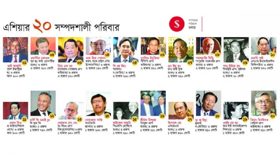 এশিয়ার শীর্ষ ধনীদের তালিকায় প্রকাশ করেছে ব্লুমবার্গ ওয়েলথ। প্রতিবেদন অনুযায়ী, এশিয়ার শীর্ষ ২০ ধনী পরিবারের হাতে রয়েছে মোট ৩৯ লাখ ৮১ হাজার ৮০০ কোটি টাকা (৪৬ হাজার ৩০০ কোটি ডলার) রয়েছে।