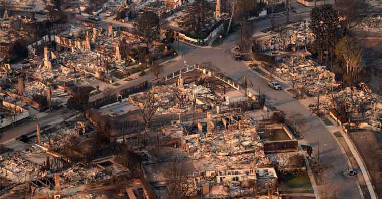 ভয়াবহ দাবানলে লস অ্যাঞ্জেলেস শহরের অন্যতম বিলাসবহুল অঞ্চল প্যাসিফিক প্যালিসেডস অধিকাংশ বাড়ি পুড়ে গেছে/ ছবি: এএফপি