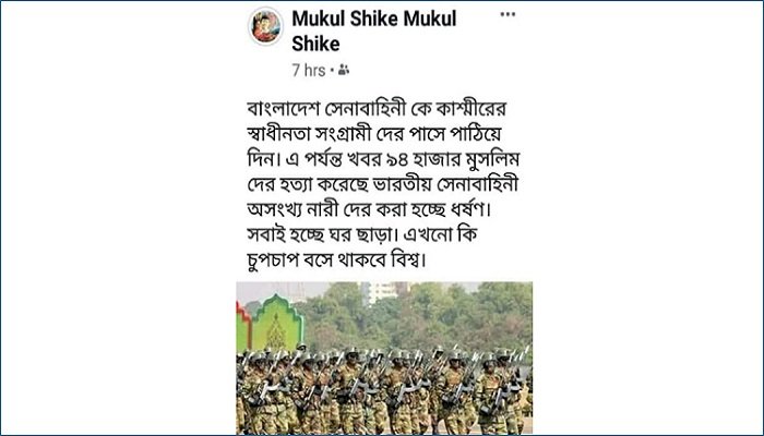 এই অবস্থার মধ্যে ফেসবুকে কাশ্মীর নিয়ে পোস্ট দেয়ায় বাংলাদেশের এক নাগরিককে গ্রেপ্তার করা হয়েছে বলে জানা গেছে। কলকাতার নিউটাউন থেকে শাহিনুর রহমান নামে ওই ব্যক্তিকে গ্রেপ্তার করা হয়।