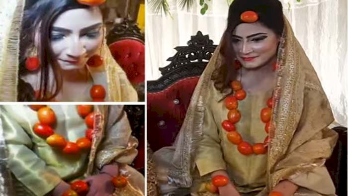 পাকিস্তানে টমেটোর দাম আকাশ ছোঁয়া। এই আকাশছোঁয়া দামের প্রতিবাদে পাকিস্তানের এক যুবতী টমেটোর গয়না পরে বসলেন বিয়ের পিঁড়িতে। এমনই একটি ভিডিও পোস্ট করেছেন পাকিস্তানের এক মহিলা সাংবাদিক। মুহূর্তেই এই ভিডিও ভাইরাল হয়ে যায়।