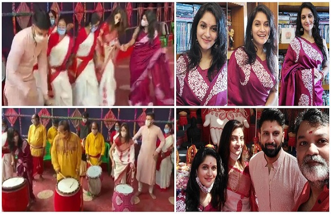 নাচ শেষে মিথিলাকেও দেখা যায় ঢাক বাজাতে। এসময় পাশেই ছিলেন তার স্বামী সৃজিত মুখার্জি। বোঝাই যাচ্ছে শ্বশুরবাড়ি কলকাতায় দুর্গাপূজার উৎসব বেশ উপভোগ করছেন মিথিলা।