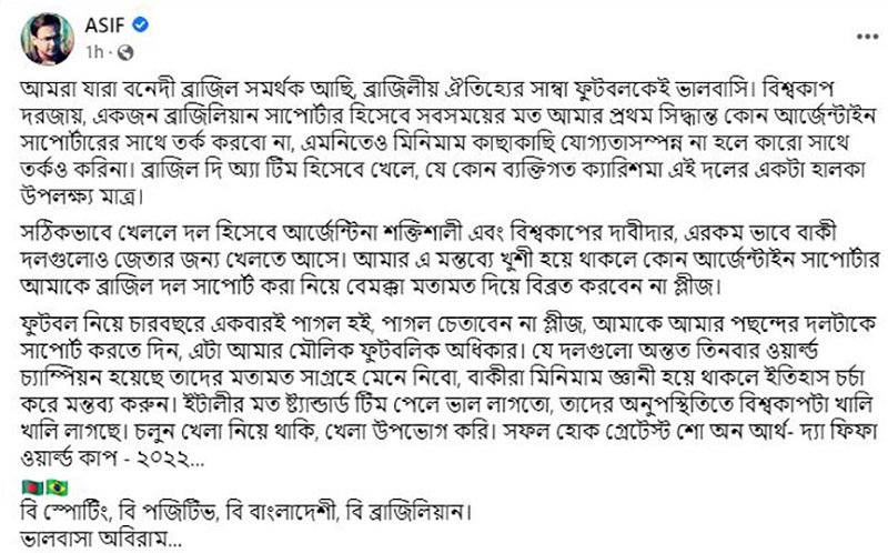বুধবার (১৬ নভেম্বর) সকাল পৌনে ১০টায় ভেরিফাইড ফেসবুক পেজে গায়ক আসিফ এক পোস্টে লেখেন, “আমরা যারা বনেদী ব্রাজিল সমর্থক আছি, ব্রাজিলীয় ঐতিহ্যের সাম্বা ফুটবলকেই ভালোবাসি। বিশ্বকাপ দরজায়, একজন ব্রাজিলিয়ান সাপোর্টার হিসেবে সব সময়ের মতো আমার প্রথম সিদ্ধান্ত কোনো আর্জেন্টাইন সাপোর্টারের সঙ্গে তর্ক করব না, এমনিতেও মিনিমাম কাছাকাছি যোগ্যতাসম্পন্ন না হলে কারো সঙ্গে তর্কও করি না।”