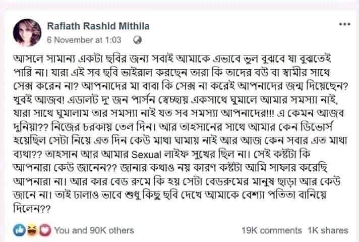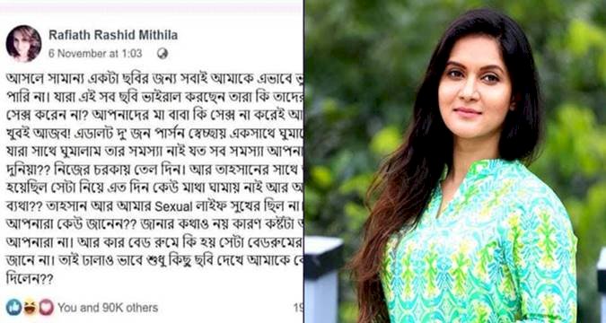 এবার মিথিলা কান্ডে হাওয়া দিতে ঘটেছে আরেক কান্ড। রাফিয়াত রাশিদ মিথিলা নামের এক ফেক (আসল কি নকল তা এখনো জানা যায়নি) আইডি থেকে একটি স্ট্যাটাস শেয়ার করা হয়েছে গত ৬ নভেমম্বর যেখানে তাহসান মিথিলার সেক্সসুয়েল লাইফ নিয়ে কথা বলা হয়েছে। সেই আইডি থেকে এও বলা হয়েছে তাহসানের সাথে সেক্সসুয়েল লাইফে সুখি ছিলেন না মিথিলা। এই কষ্টটি একমাত্র তিনিই বুঝতেন।