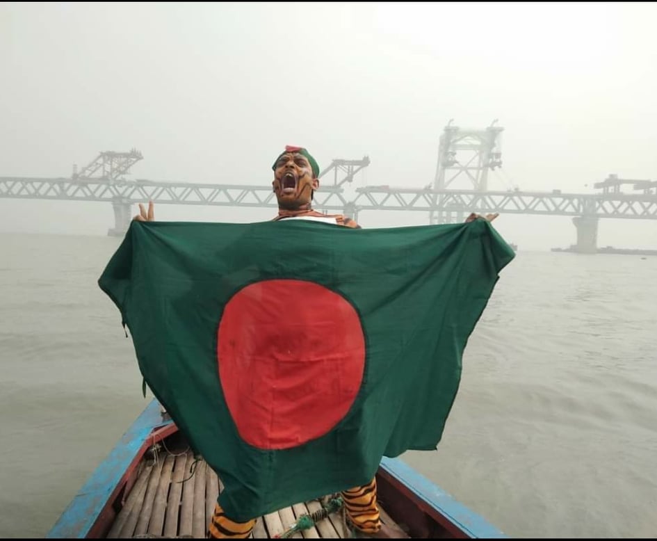 একটি ট্রলারে চিরচেনা বাঘের আদলে জাতীয় পতাকা নিয়ে সেতুর সামনে গিয়েছিলেন শোয়েব।