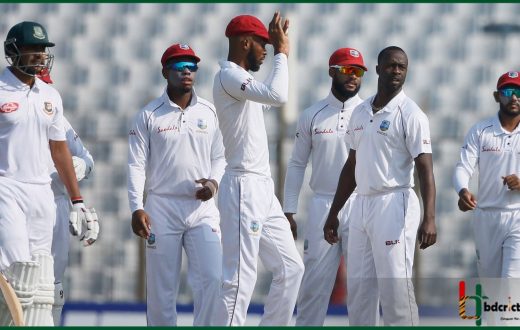 ঢাকা টেস্টে বাংলাদেশের বিপক্ষে ওয়েস্ট ইন্ডিজ তাদের প্রথম ইনিংসে করে ৪০৯ রান। জবাবে ব্যাট করতে নেমে শুরুতেই ব্যাটিং বিপর্যয়ে পড়ে টাইগাররা। ১১ রানের হারায় সৌম্য ও শান্তর উইকেট। এরপর ৭১ রানের মধ্যে তামিম-মুমিনুলকে হারিয়ে কার্যত কোণঠাসা হয়ে পড়ে বাংলাদেশ।