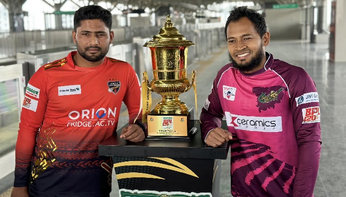 স্পোর্টস ডেস্ক: বাংলাদেশ প্রিমিয়ার লিগের (বিপিএল) অষ্টম আসরের পর্দা নামছে আগামীকাল বৃহস্পতিবার। এই ম্যাচে মুখোমুখি হবে সিলেট স্ট্রাইকার্স এবং কুমিল্লা ভিক্টোরিয়ান্স। সে উপলক্ষ্যে আজ বুধবার আনুষ্ঠানিক ফটোসেশনে কিছুটা নতুনত্ব নিয়ে আসলো বিপিএল। মাঠের বদলে এবার ফটোসেশন হয়েছে আগারগাঁওয়ে। কয়েকদিন আগে চালু হওয়া মেট্রোরেলে বসে ট্রফি নিয়ে ছবি তুলেছেন কুমিল্লার অধিনায়ক ইমরুল কায়েস ও সিলেটের ক্রিকেটার মুশফিকুর রহিম।