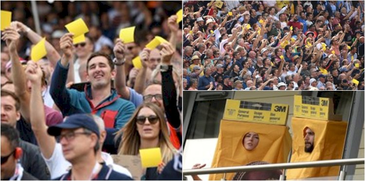 বিষয়টি এখানেই ক্ষ্যান্ত হননি। ডেভিড ওয়ার্নার আউট হলে তা অন্য মাত্রা পায়। ব্রডের বলে এলবিডব্লিউ হয়ে সাজঘরে ফেরেন তিনি। পথিমধ্যে গ্যালারির একটা অংশের দর্শক দাঁড়িয়ে তাকে ‘হলুদ কার্ড’-দেখান। সেগুলো ছিল শিরিশ কাগজ।