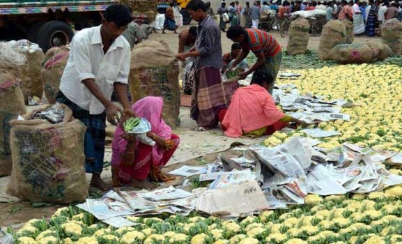 আজ বৃহস্পতিবার সকালে জেলার বৃহৎ মহাস্থানগড় সবজি বাজারে সরজমিনে গিয়ে দেখা যায়, মাঠে সাজিয়ে রাখা আছে ফুলকপি, বাঁধাকপি, ডাটা ও বাঁধাকপি।