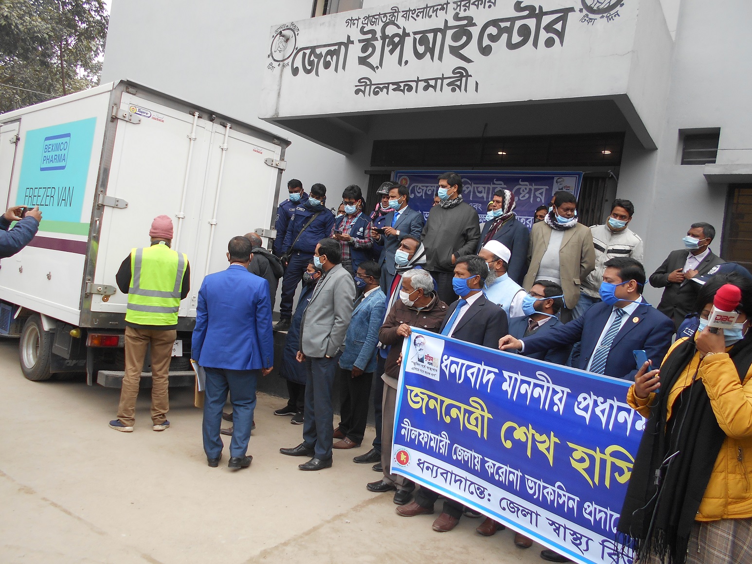নীলফামারীতে ৬০ হাজার ডোজ করোনা ভাইরাসের ভ্যাকসিন টিকা পৌঁছেছে। গতকাল রবিবার দুপুরের দিকে টিকা বহনকারী একটি ফ্রিজারভ্যানে সিভিল সার্জন অফিসের ইপিআই ষ্টোরে সংরক্ষণ করা হয়। এ সময় টিকা গ্রহণ করেন সিভিল সার্জন ডা. জাহাঙ্গীর কবির, জেলা প্রশাসনের নির্বাহী ম্যাজিস্ট্রেট জাহিদ ইমরুল মোজাক্কিন।