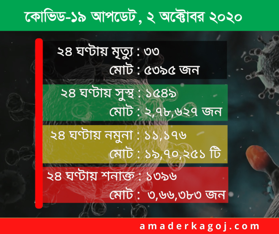 এদিকে, গত ২৪ ঘণ্টায় বাংলাদেশে কোভিড-১৯ রোগ থেকে সুস্থ হয়েছেন ১,৫৮৯ জন। বাংলাদেশে এ পর্যন্ত কোভিড-১৯ থেকে মোট সুস্থ মানুষের সংখ্যা ২ লাখ ৭৮ হাজার ৬২৭ জন।