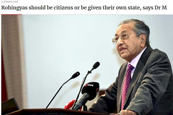 রোহিঙ্গাদেরকে হয় নাগরিকত্ব, নয় তাদেরকে নিজস্ব রাষ্ট্র গঠনের জন্য ভূখণ্ড দিতে হবে বলে মন্তব্য করেছেন মালয়েশিয়ার প্রধানমন্ত্রী মাহাথির মোহাম্মদ। শুক্রবার তুরস্কের রাজধানী আঙ্কারায় দেশটির সরকার পরিচালিত সংবাদ সংস্থা আনাদোলু এজেন্সিকে দেয়া এক বিশেষ সাক্ষাৎকারে একটি প্রশ্নের জবাবে তিনি এই মন্তব্য করেন। খবর দ্য নিউ স্ট্রেইট টাইমস'র।