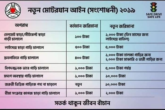 নতুন আইনে হেলমেট ছাড়া বা সিটবেল্ট ছাড়া গাড়ি চালালে জরিমানা ১ হাজার টাকা (তিন মাসের জন্য লাইসেন্স বাতিল), আগে জরিমানা ছিল ১০০ টাকা। এছাড়া লাইসেন্স ছাড়া গাড়ি চালালে ৫০০ টাকা থেকে জরিমানা বাড়িয়ে ৫ হাজার টাকা করার প্রস্তাব করা হয়েছে মোটরযান আইনে। আর দ্রুতগতিতে গাড়ি চালালে জরিমানা ৪০০ টাকা থেকে বাড়িয়ে হালকা গাড়ির জন্য ১ হাজার এবং মাঝারি ও ভারী গাড়ির জন্য ২ হাজার টাকা করা হয়েছে।