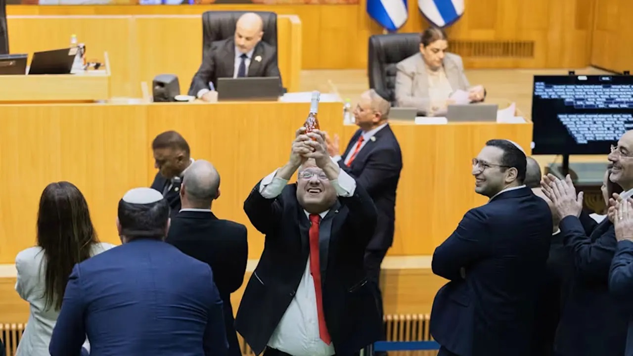 ফিলিস্তিনিদের মৃত্যুদণ্ড দেওয়ার আইন পাসের পর নেসেটে আইনপ্রণেতাদের নিয়ে উল্লাস করছেন ইসরায়েলি মন্ত্রী ইতামার বেন-গভির । সোমবার, ৩০ মার্চ ২০২৬